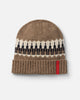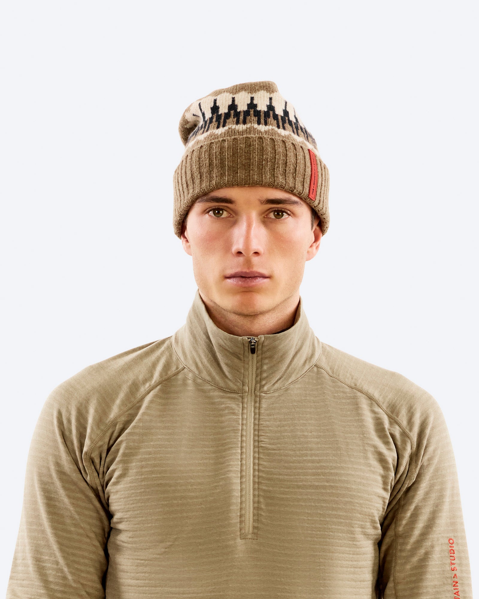 Knitted, patterned beanie with a wide cuff. Made from a soft and warm lambswool and polyamide blend. Features a silicone logo patch on the front.