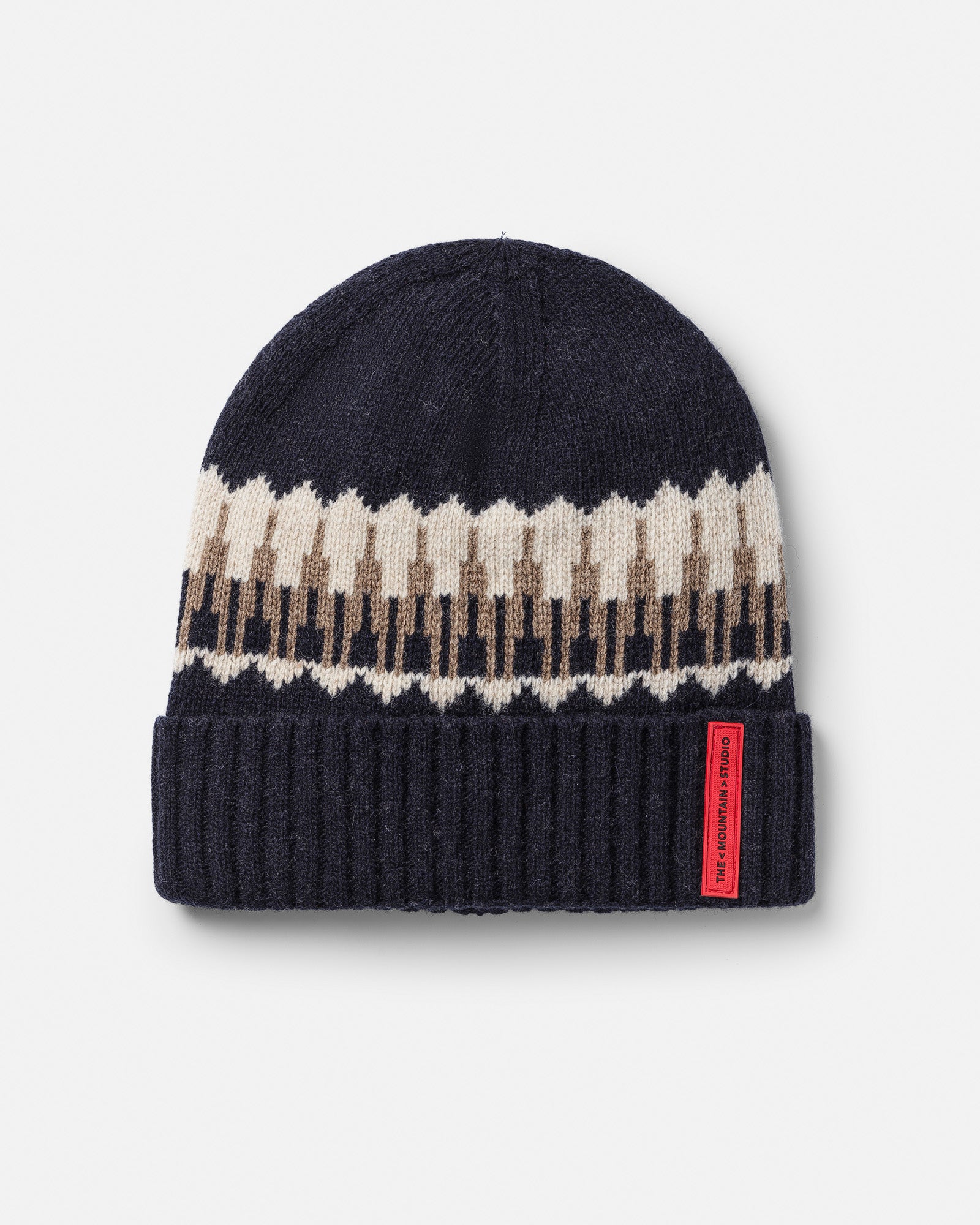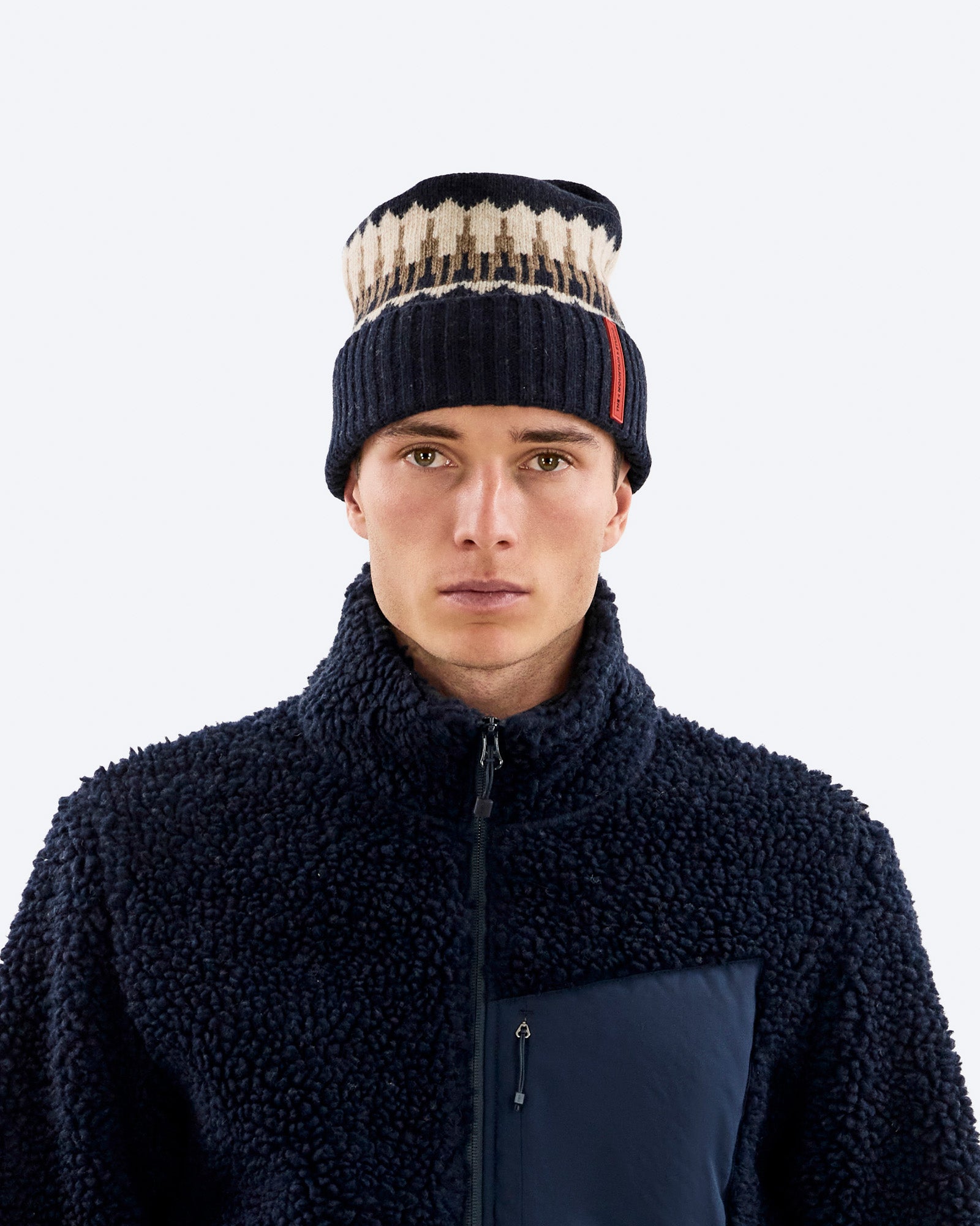 Knitted, patterned beanie with a wide cuff. Made from a soft and warm lambswool and polyamide blend. Features a silicone logo patch on the front.