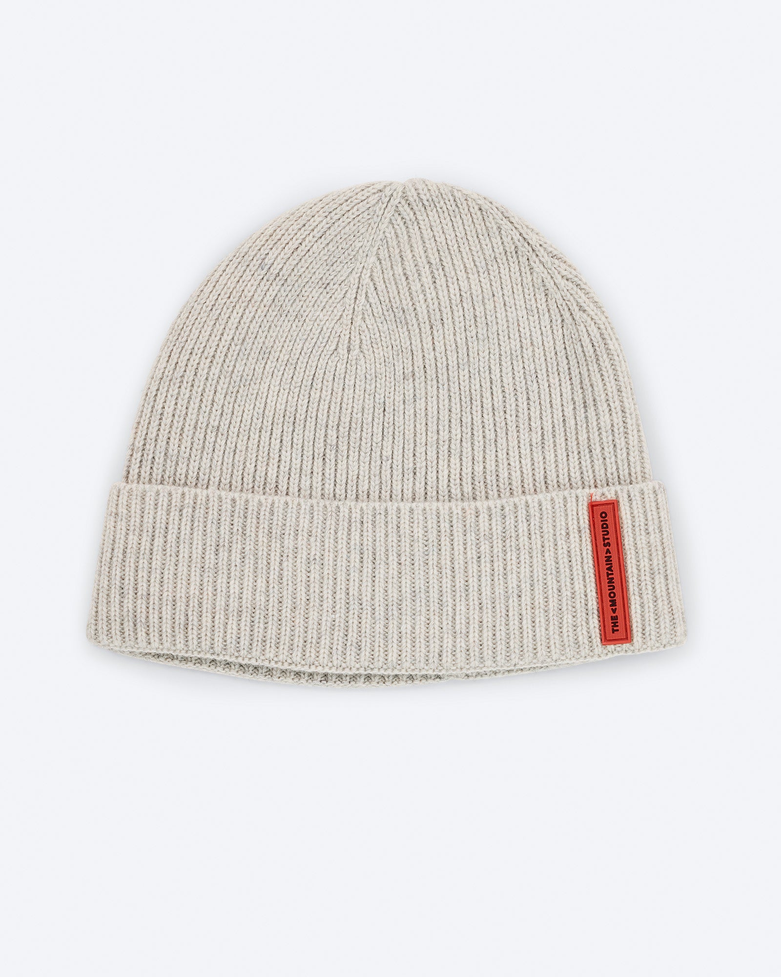 Ribbed beanie with a wide cuff in soft wool knit. Features a silicone The Mountain Studio logo patch on the front.
