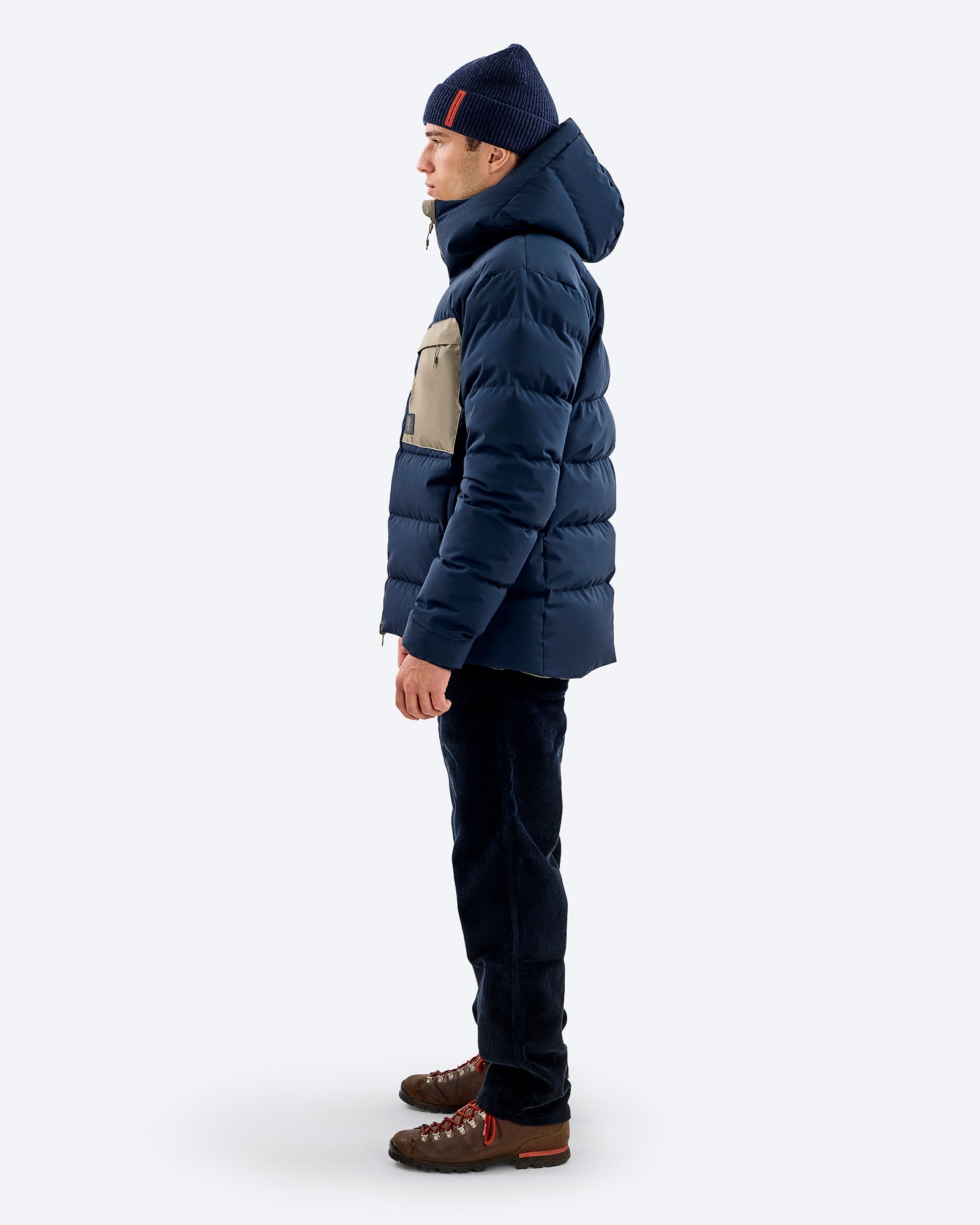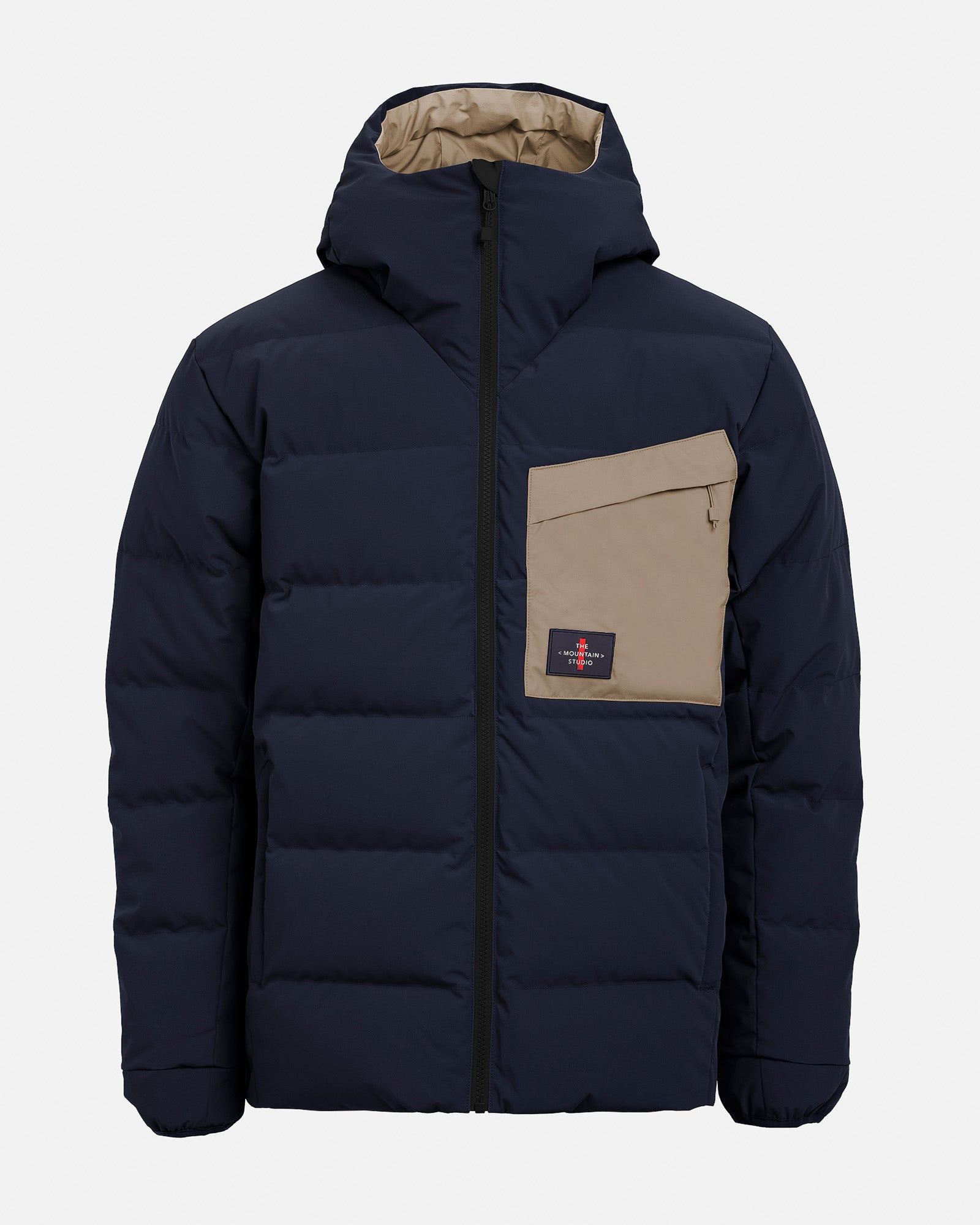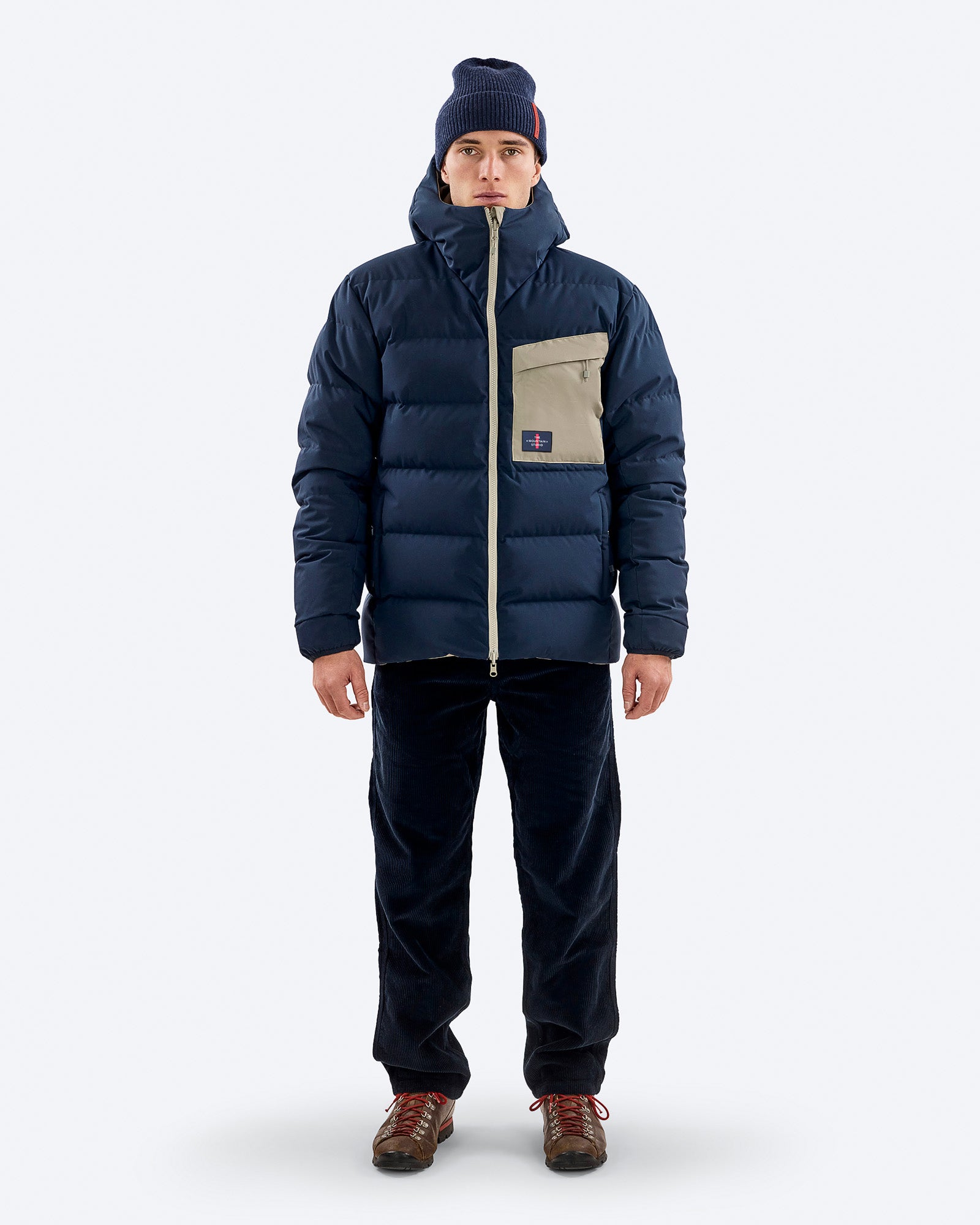 Reversible down jacket for cold weather skiing and snowboarding and lifestyle wear. The D-1 R offers two distinctly different looks: one sleek and refined and the other quilted. The sleek side lends a more technical look, while the quilted side provides a classic down appearance. Whatever you choose is up to you and the situation.