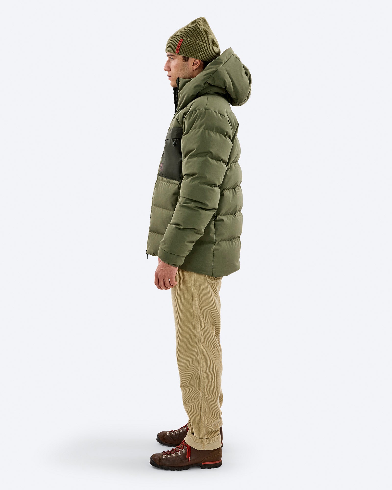 Reversible down jacket for cold weather skiing and snowboarding and lifestyle wear. The D-1 R offers two distinctly different looks: one sleek and refined and the other quilted. The sleek side lends a more technical look, while the quilted side provides a classic down appearance. Whatever you choose is up to you and the situation.