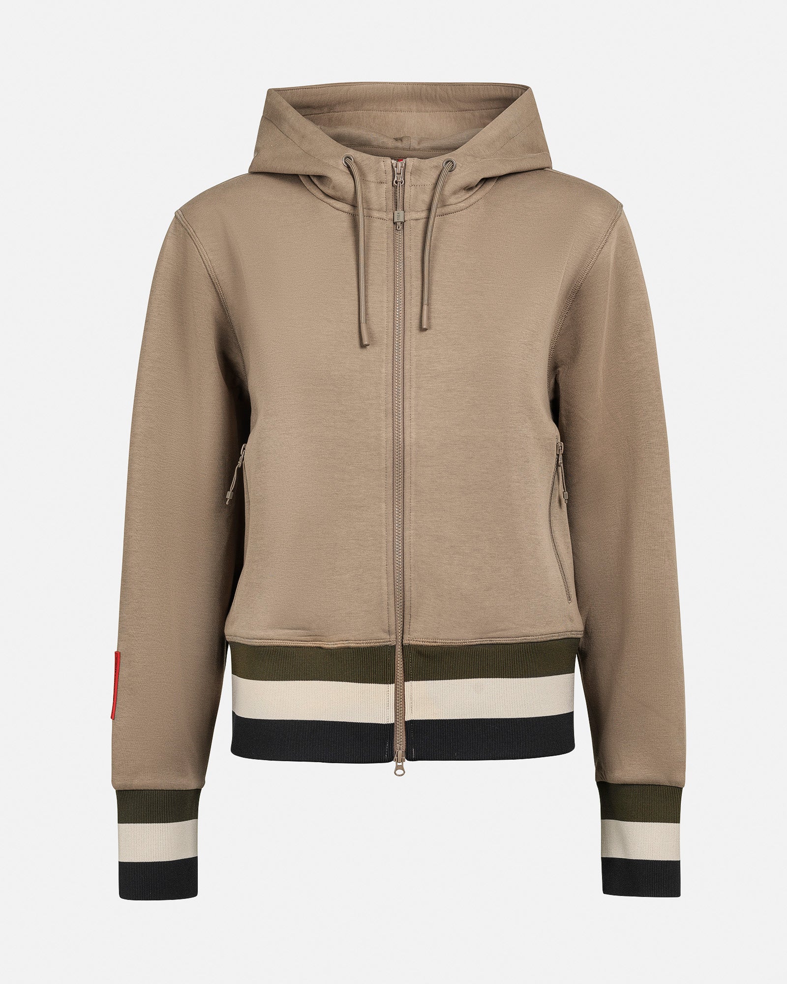Women's hoodie with a full-length zipper. A short, boxy fit paired with wide cuffs and a lower hem creates a unique, modern look yet with a classic holiday feel.