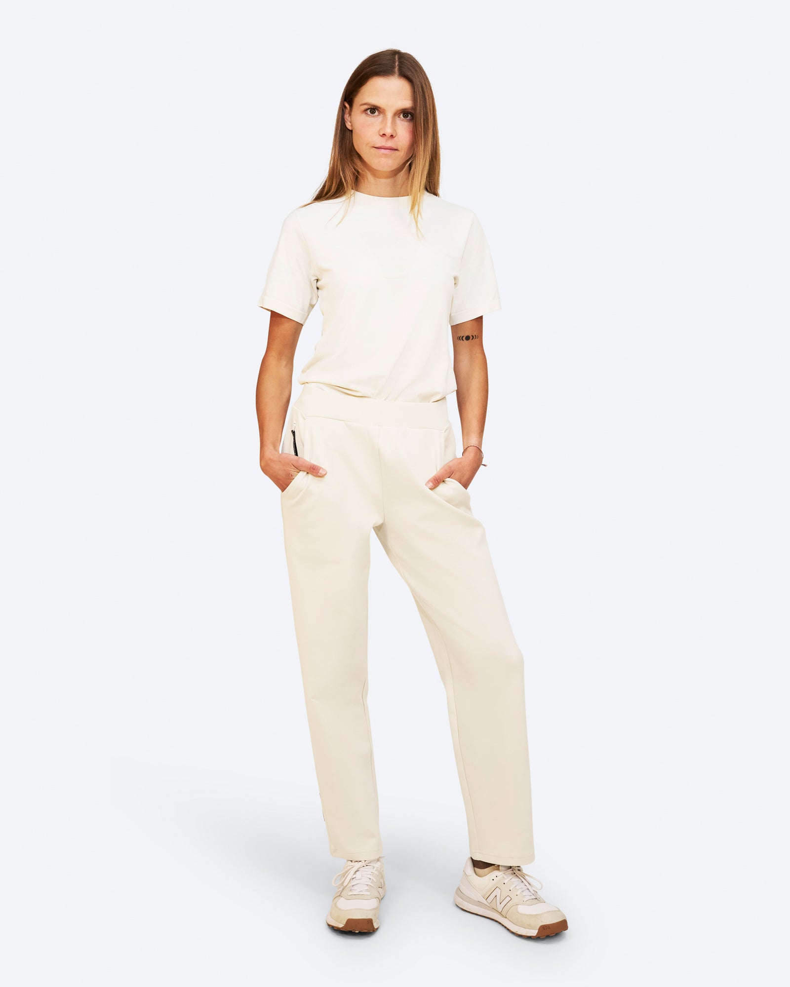 Constructed from a 260g/m² jersey blend of 77% cotton, 17% polyester, and 6% elastane, these pants deliver soft material casual trousers with dependable stretch. The fabric is engineered for lightweight durability, supporting abrasion resistance and long-term comfort. The inclusion of a zippered pocket and two back pockets adds functional storage for valuables and small items. The vertical silicone logo on the leg is subtle, reflecting a focus on minimalist design and stylish pants with cool features.