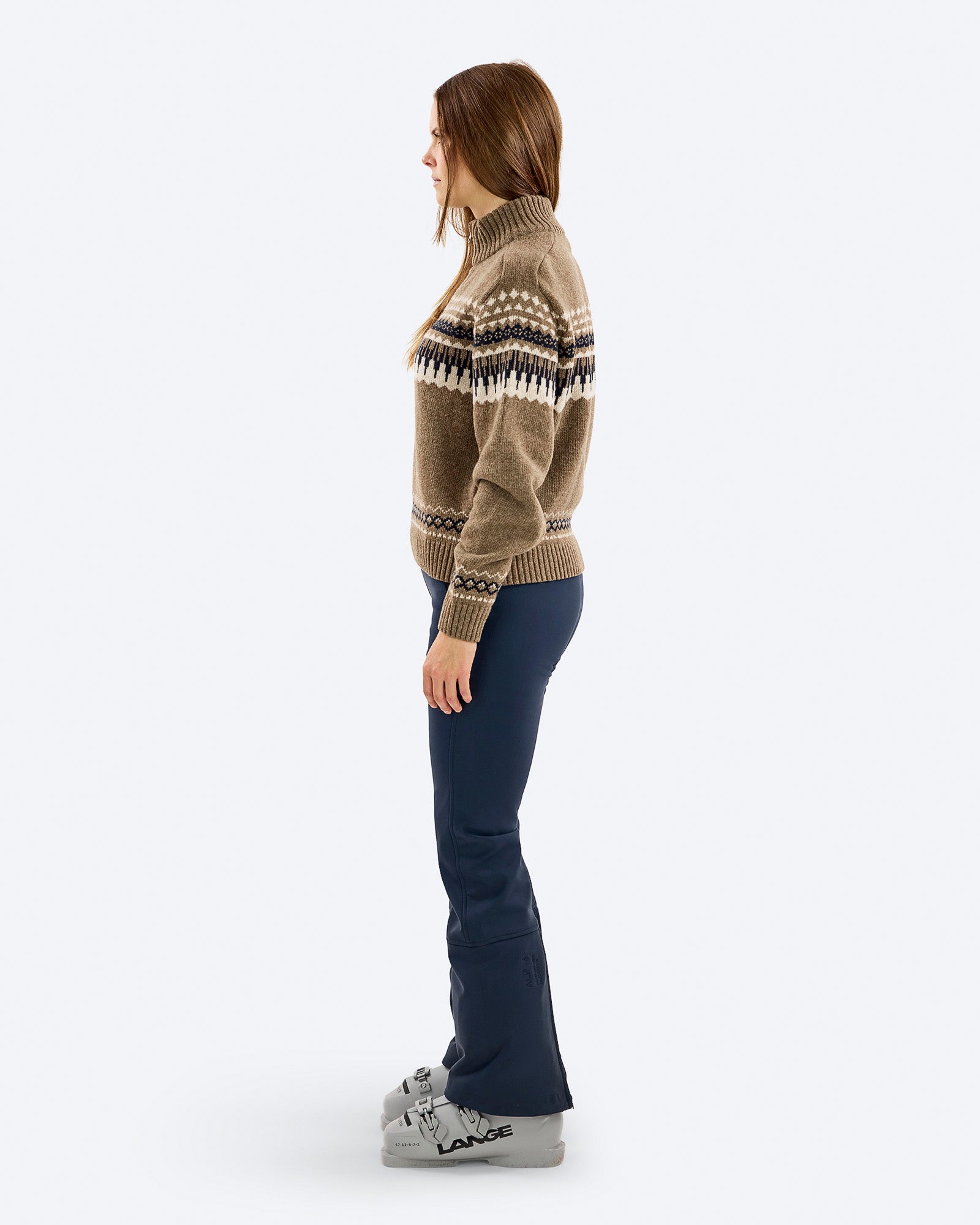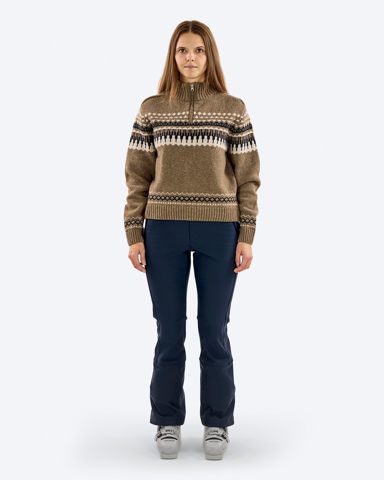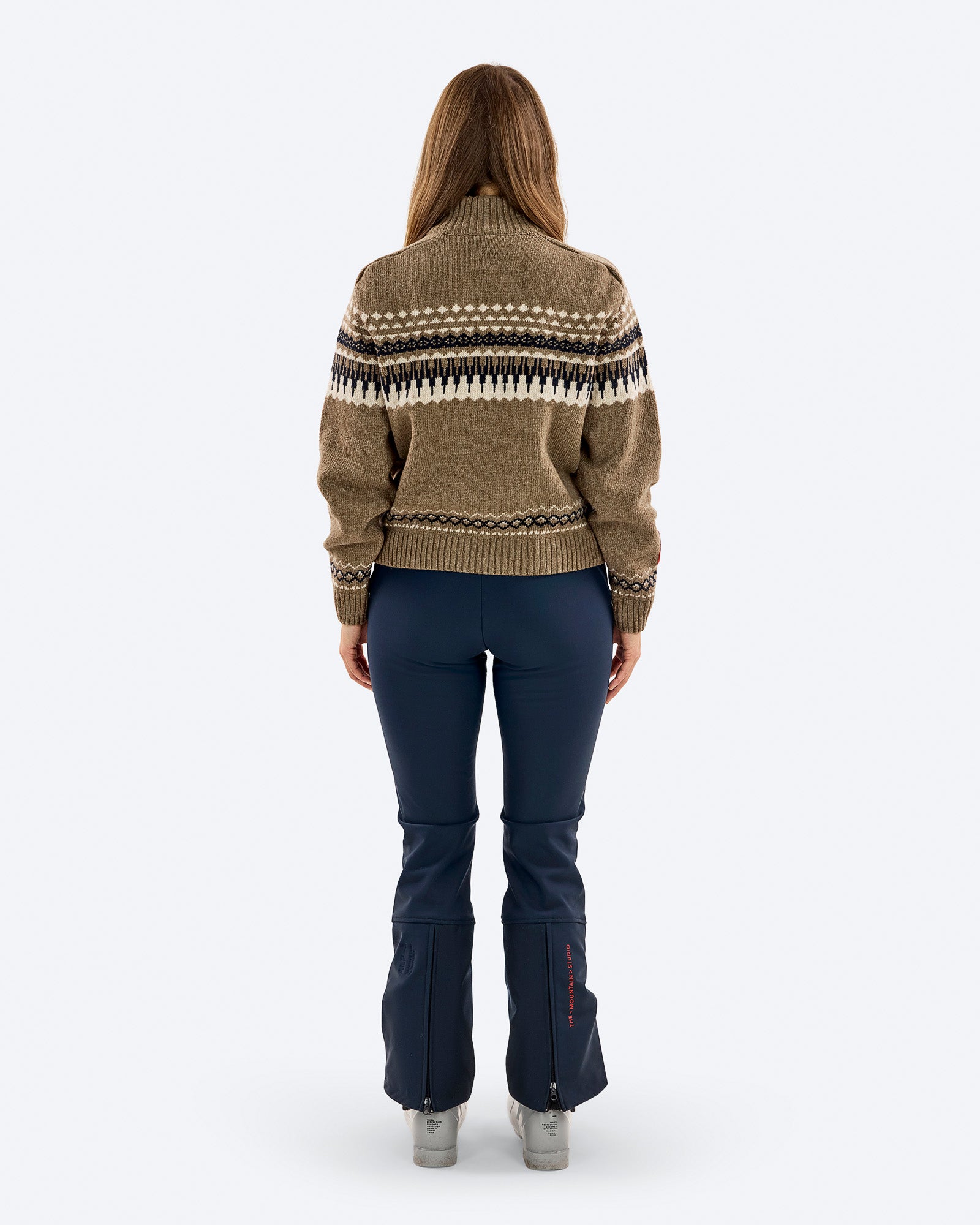 Zippered lambswool sweater in a timeless, classic style. It features a quarter-length zipper and a tall collar. The slightly shorter, boxy cut adds a modern cut to a sweater, steeped in tradition and inspired by classic mountain culture.