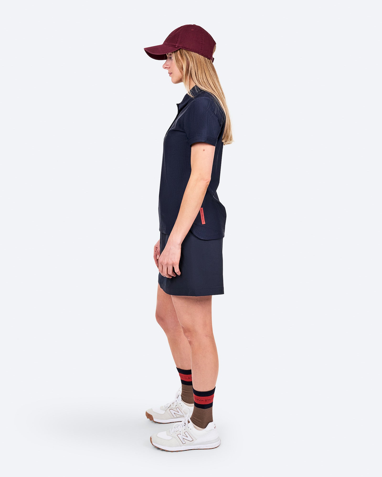 This women's stretch polo shirt is constructed from a 63% nylon, 37% elastane stretch jersey jacquard at 185 GSM. The fabric holds its shape and provides moisture management for warm weather, supporting odor resistance and all-day freshness. Japanese Sun Grip press buttons keep the front minimal, while the signature side cut increases mobility and ensures an ergonomic fit. The vertical silicone logo at the back offers a subtle, functional detail that aligns with Mountain Studio's understated style.