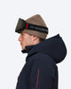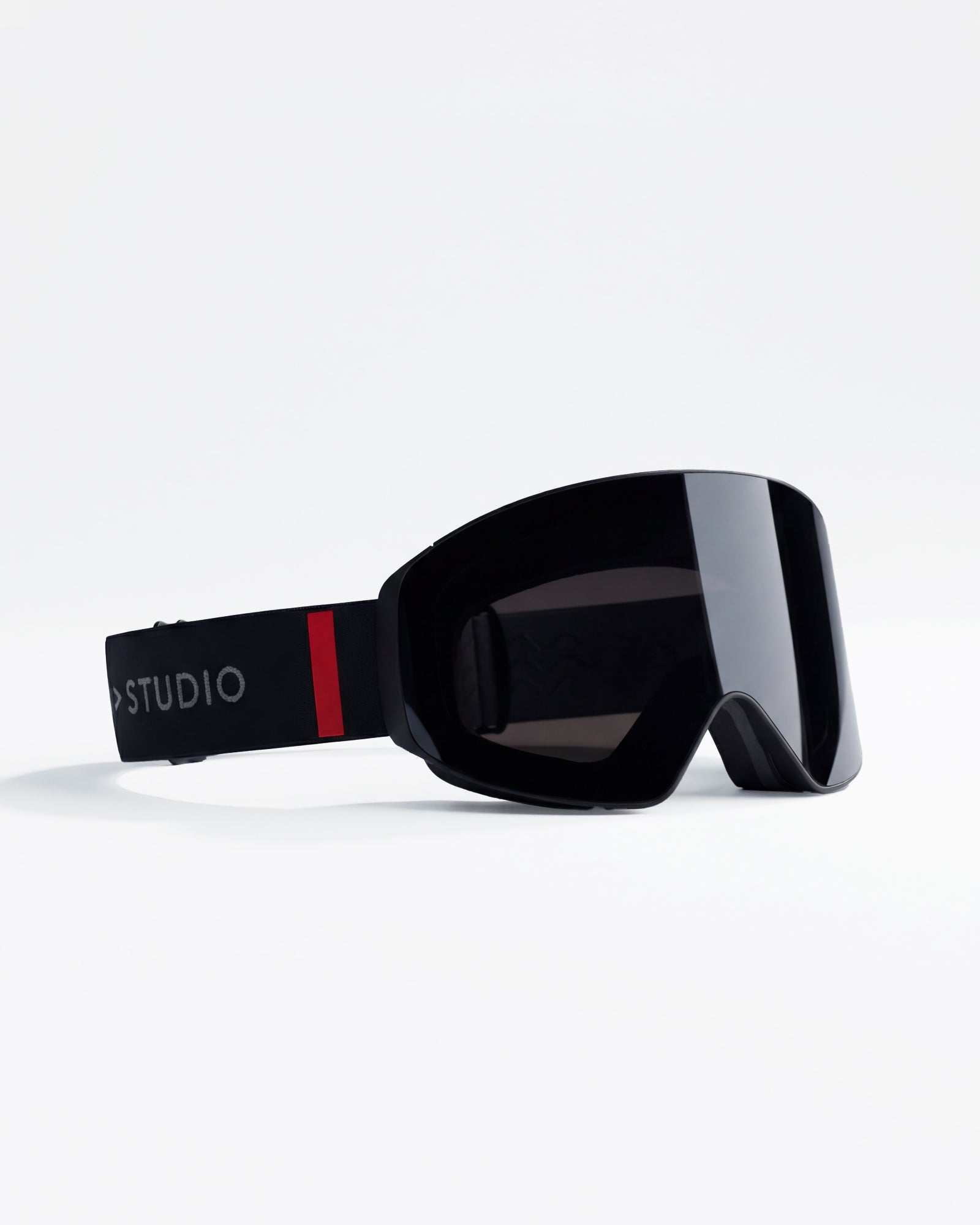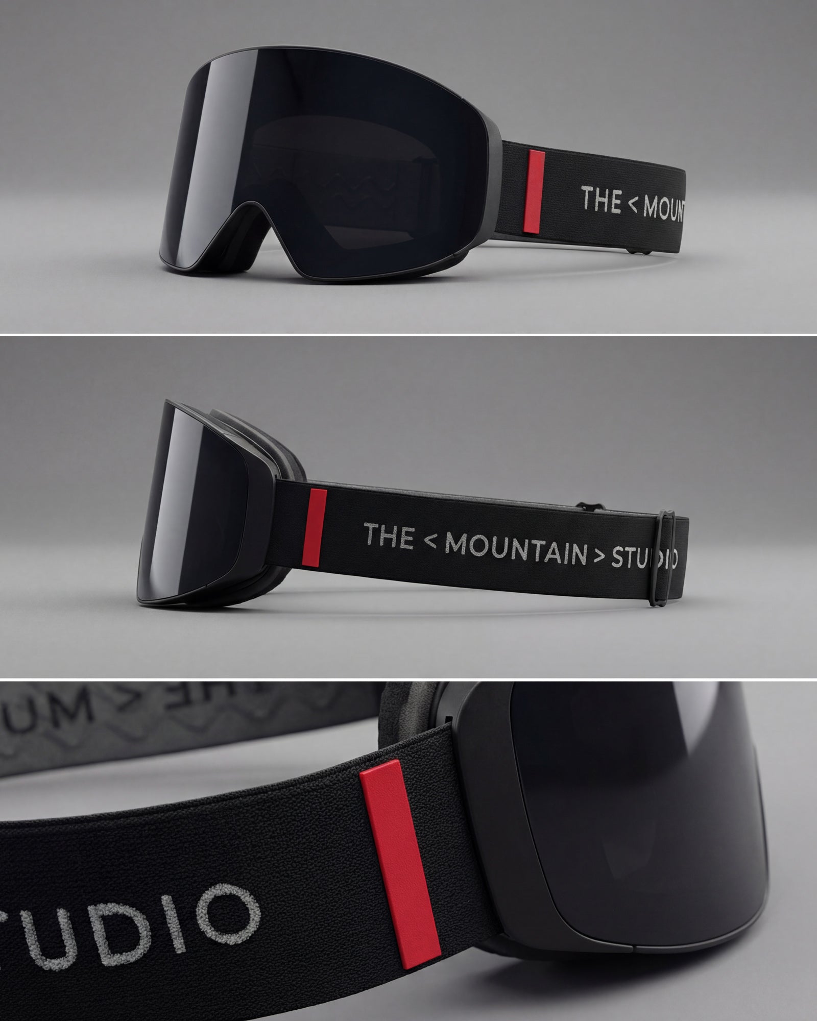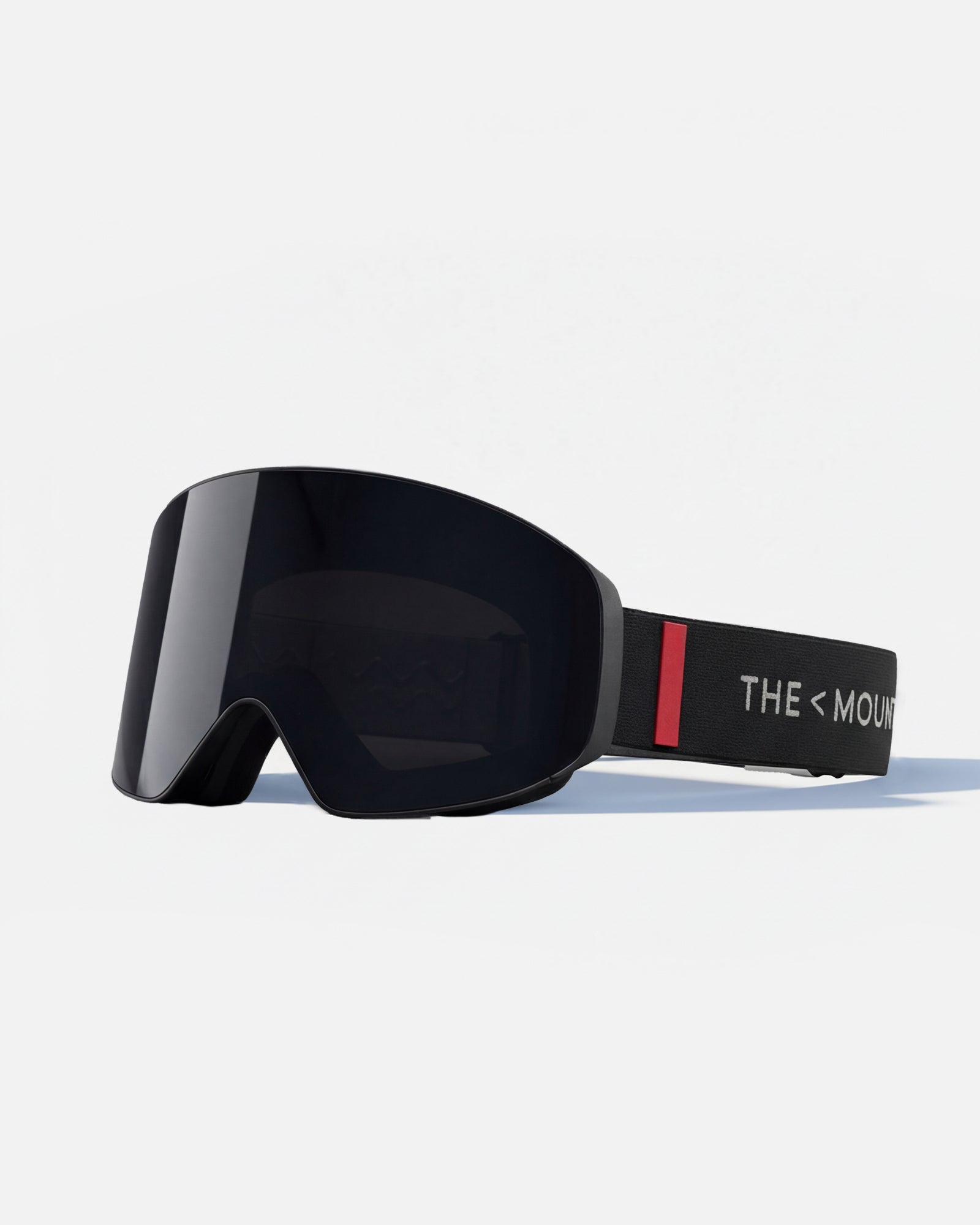 The magnetic lens system allows for quick and effortless lens changes as the weather shifts. Two lenses are included: a dark grey lens (6%, S4) for bright, sunny days, and a spare clear lens (85%, S0) for low-light conditions or night skiing. The matte black frame is paired with a black elastic strap featuring our small red silicone The Mountain Studio logo patch.